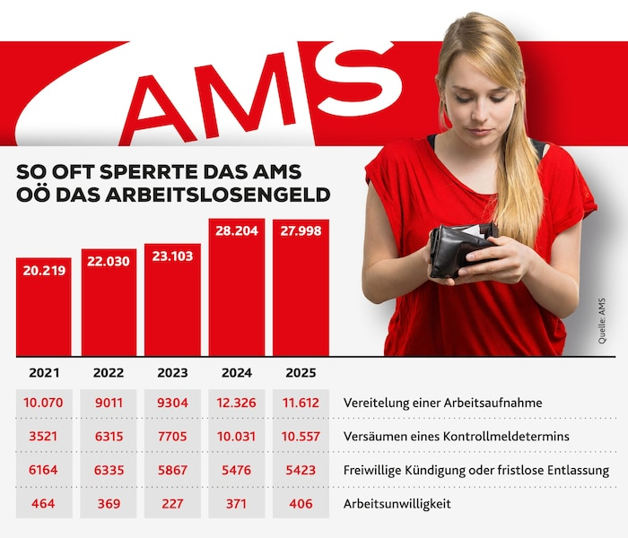 Das Arbeitsmarktservice Oberösterreich verhängte im Vorjahr fast 28.000 Sanktionen, also Sperren des Arbeitslosengeldes – um knapp 40 Prozent mehr als noch vor fünf Jahren. Meinen es also immer weniger ernst mit der Jobsuche? Nein, sagt AMS-Chefin Iris Schmidt. Es gebe mehrere andere Erklärungen.